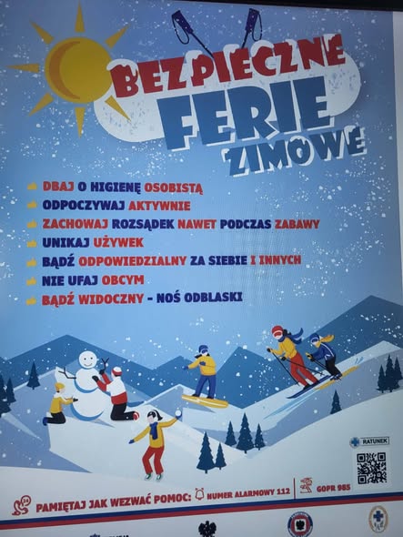 Bezpieczne ferie zimowe to przede wszystkim zakaz wchodzenia na zamarznięte zbiorniki wodne, zabawa w dozwolonych miejscach z dala od dróg, noszenie odblasków po zmroku oraz odpowiedni ubiór. Należy używać kasków na nartach/sankach, nie organizować kuligów za samochodami oraz zgłaszać dorosłym miejsce pobytu.